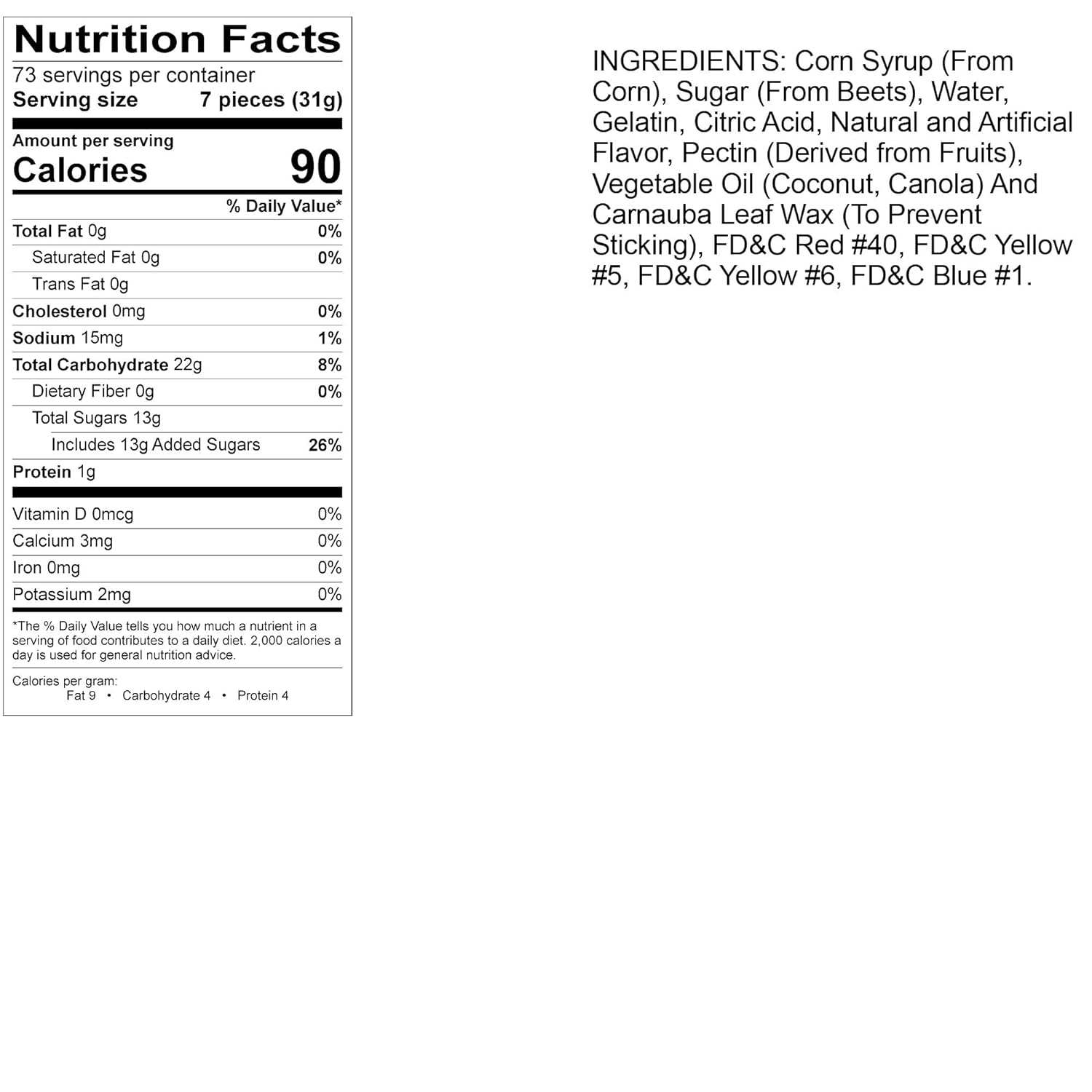Ingredients: Corn Syrup (From Corn), Sugar (From Beets), Water, Gelatin, Citric Acid, Natural and Artificial Flavors, Pectin (Derived from Fruit), Vegetable Oil (Coconut, Canola) and Carnauba Leaf Wax (To prevent Sticking), FD&C Red #40, FD&C Yellow #5, FD&C Yellow #6, FD&C Blue #1.